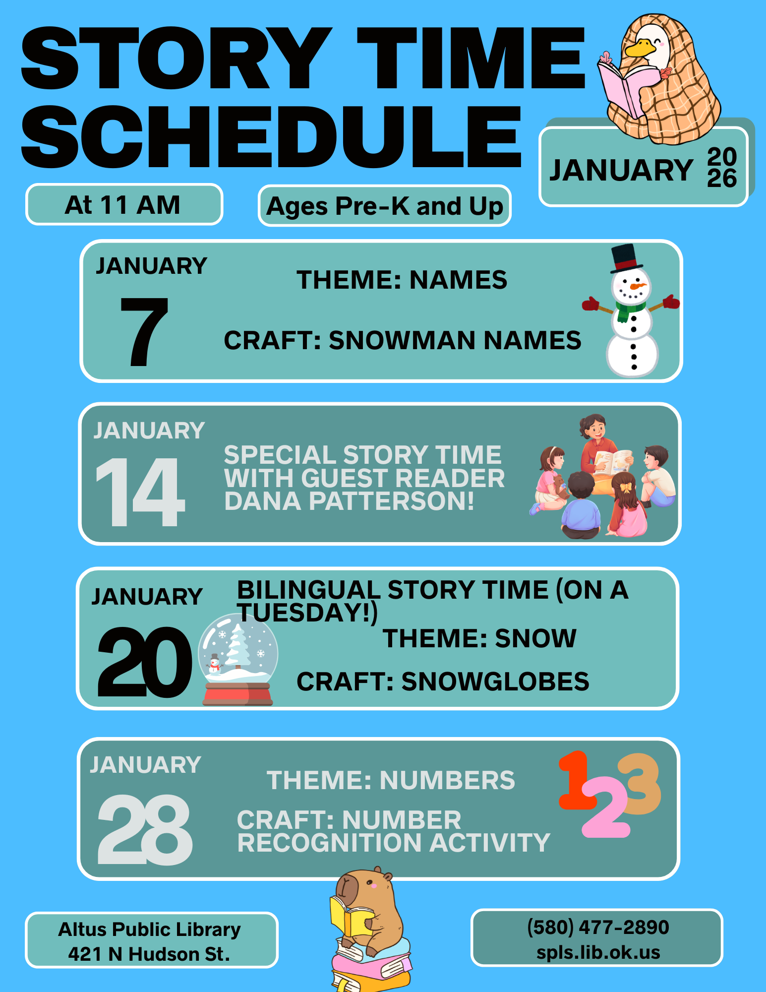 Join us Tuesday, January 20th for Bilingual Story Time at the Altus Public Library! The theme is Snow and the craft is Snowglobes!