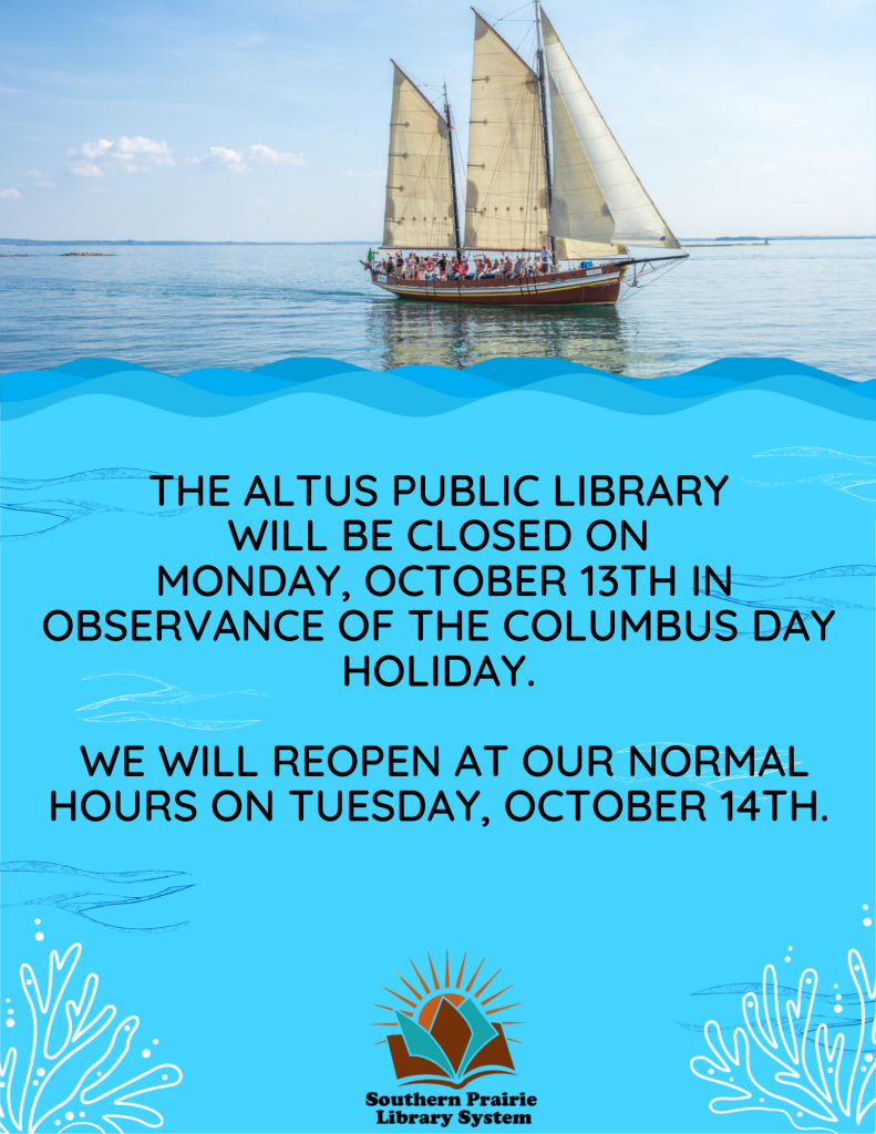 The Altus Public Library will be closed on Monday, October 13th in observance of the Columbus Day holiday.