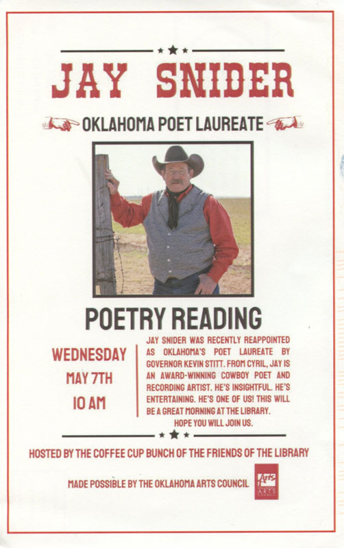 The Coffee Cup Bunch Friends of the Library welcomes Oklahoma Poet Laureate, Jay Snider, at 10:00 a.m. on Wednesday, May 7th, 2025, at the Altus Public Library, 421 N. Hudson.