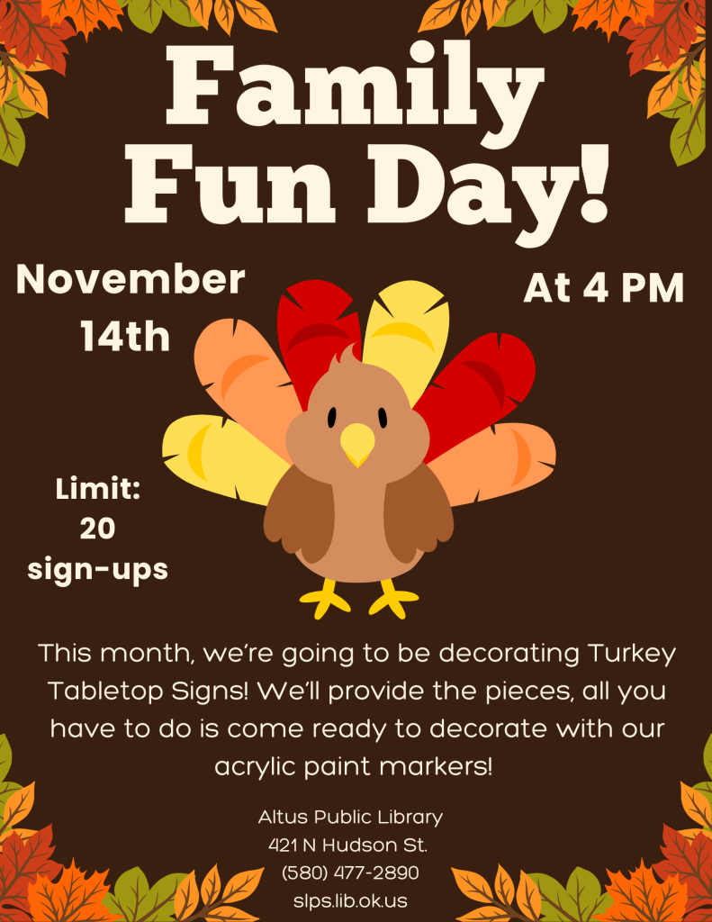 Join us at the Altus Public Library for our next Family Fun Day on Thursday, November 14th at 4 PM!