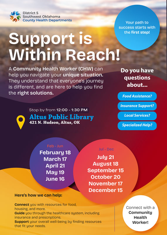 A Community Health Worker (CHW) can help you navigate your unique situation. Stop by the Altus Public Library, 421 N. Hudson, from 12:00 to 1:30 PM TODAY! There will be a CHW here to help you find the right solutions to your specific needs.