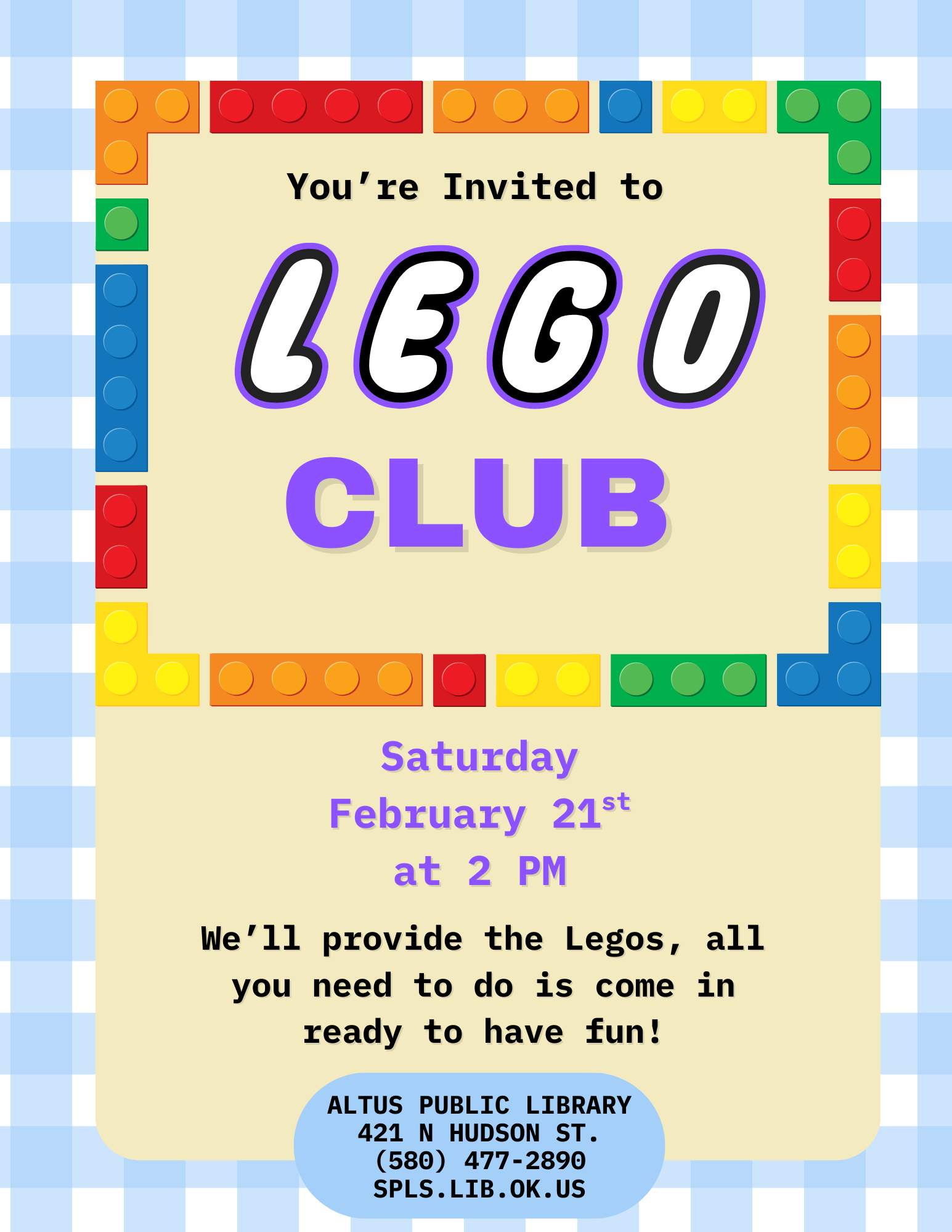Join us Saturday, February 21st, at 2 PM for our next LEGO CLUB!