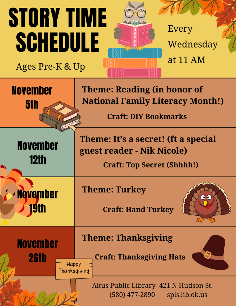 Cozy up for stories, surprises, and smiles all November long at the Altus Public Library! Each week brings a new theme, new adventures, and plenty of fun for our little book lovers (and their parents too!).