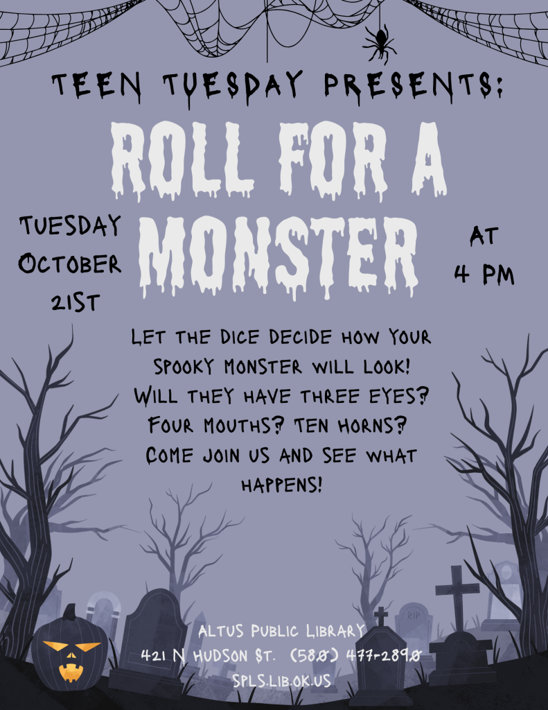 Let the dice decide how your spooky monster will look! Will they have three eyes? Four mouths? Ten horns? Come join us and see what happens!