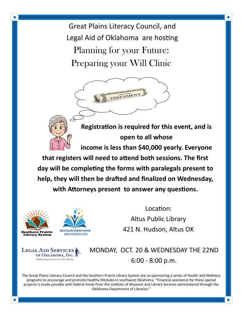 Great Plains Literacy Council and Legal Aid of Oklahoma are hosting the Planning for Your Future: Preparing Your Will Clinic.