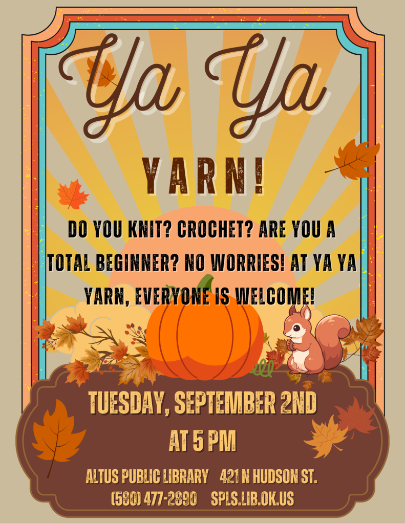 Join us on Tuesday, September 2nd at 5 PM for our next Ya Ya Yarn meeting! If you’re a total newbie or you have a project you’re working on, everyone is welcome to come! You don’t even have to just knit or crochet! If you work with anything yarn related, you’re more than welcome to come!