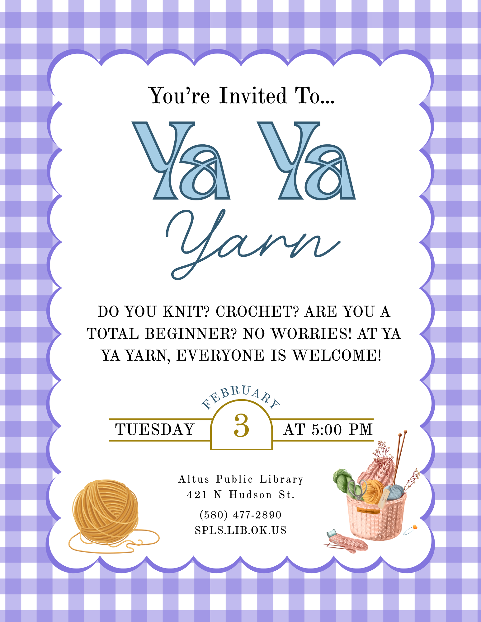 Do you knit or crochet—or have you always wanted to learn? Join us for Ya Ya Yarn at the Altus Public Library!