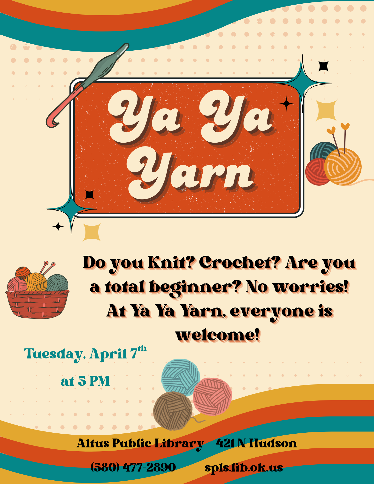 We’re gathering at 11:00 AM for a fun and relaxing morning of knitting, crocheting, and conversation at the Altus Public Library.